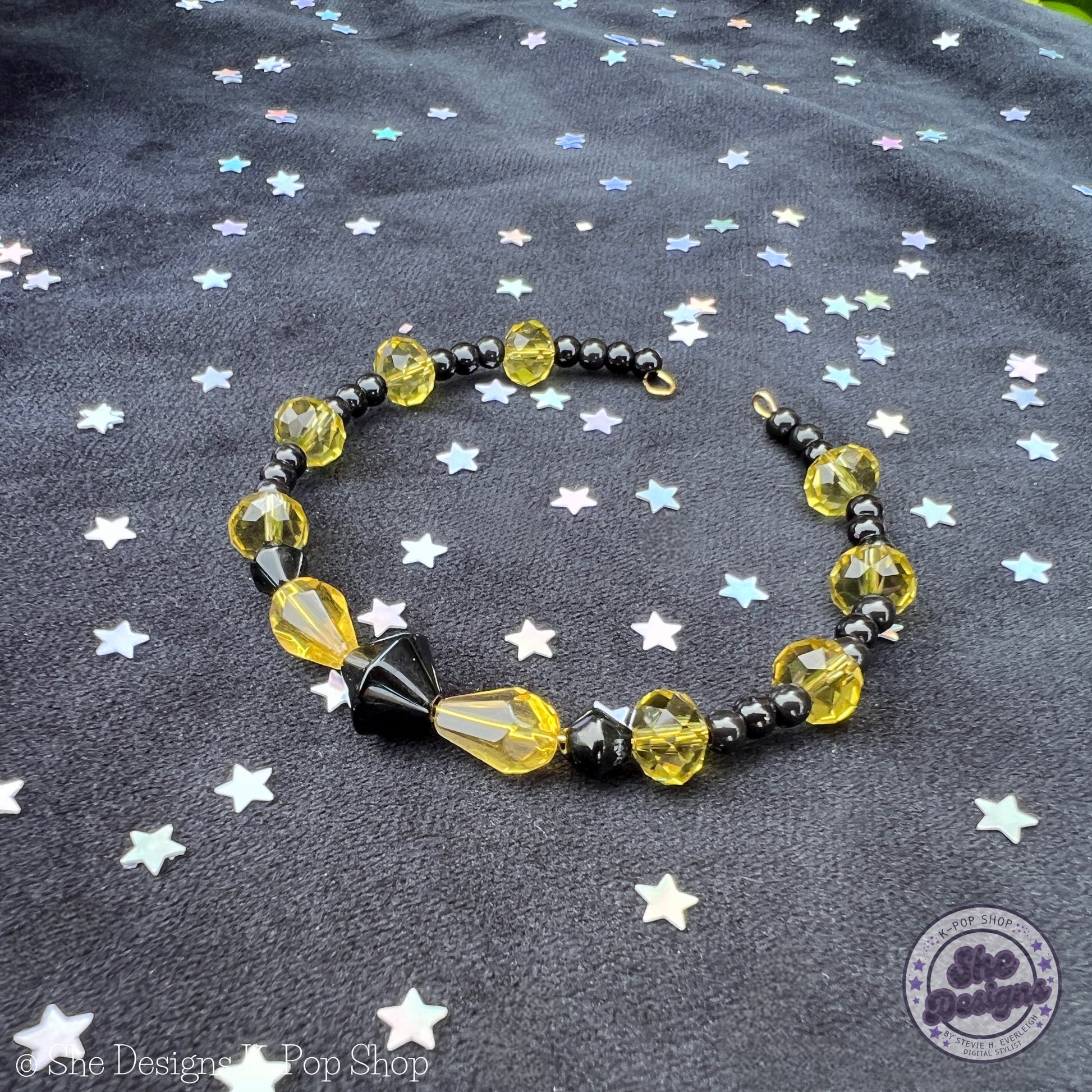 Did you first fall for BTS with their digital single Butter? If so, this collection is just for you! As one of their earliest fully English tracks, Butter helped crown them as the Kings of K-Pop in the US. This bracelet is part of our memory wire series, showcasing vibrant yellow and black hues with sparkling faceted, bicone, and seed beads. It’s a fun and stylish gift perfect for any BTS ARMY. Don’t forget to explore the rest of our Butter Collection and other cool pieces!